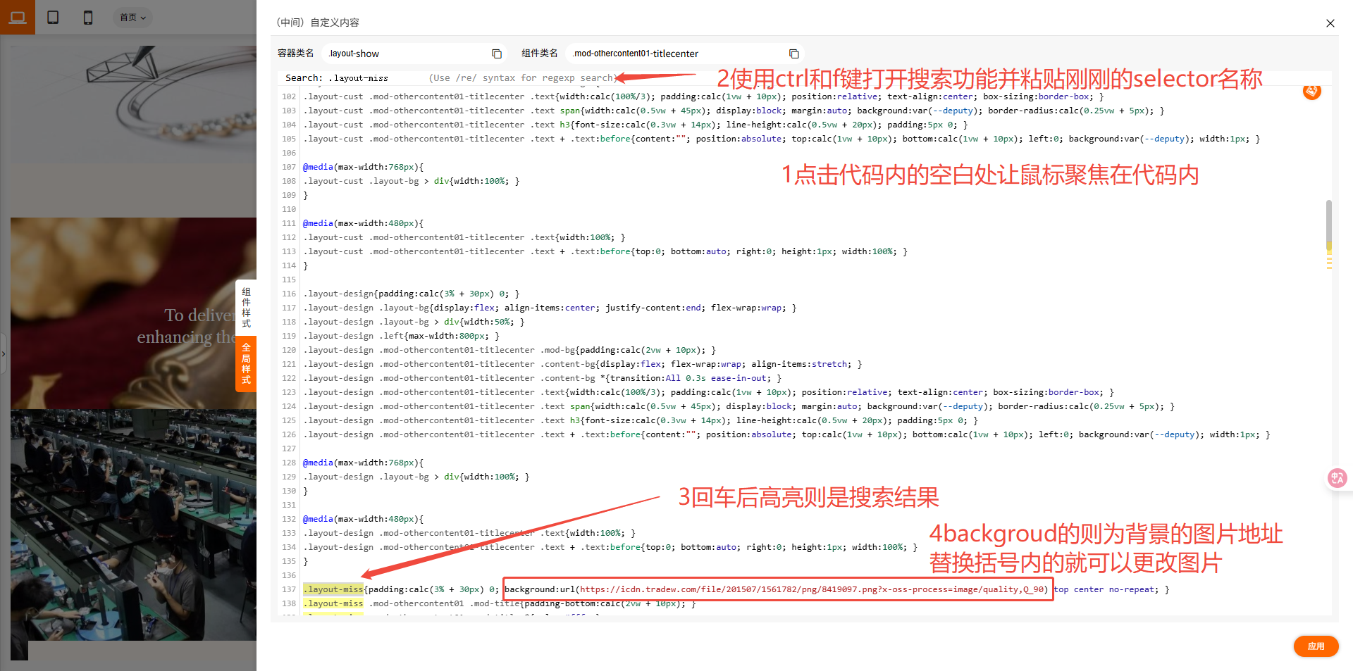 在装修后台进行装修操作时,会涉及到文字内容和图片的更改,但是有些图片是不能直接被更换的,这种图片就是组件的背景图片,需要在样式代码内进行更改图片源的地址来实现更换,下面我们开始学习如何更改它