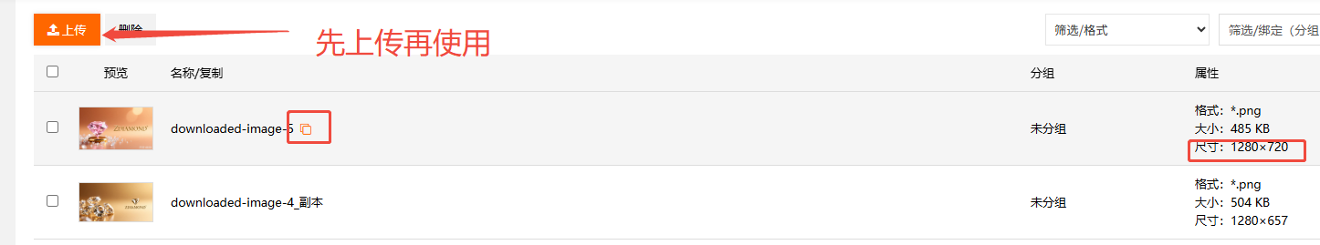 注意,替换时建议先复制原来的图片链接在浏览器打开查看图片尺寸,在尺寸不一致的情况下替换会导致图片被拉伸等处理,使布局美观度下降,建议是在查看图片尺寸后再上传对应尺寸的新图片再进行替换。