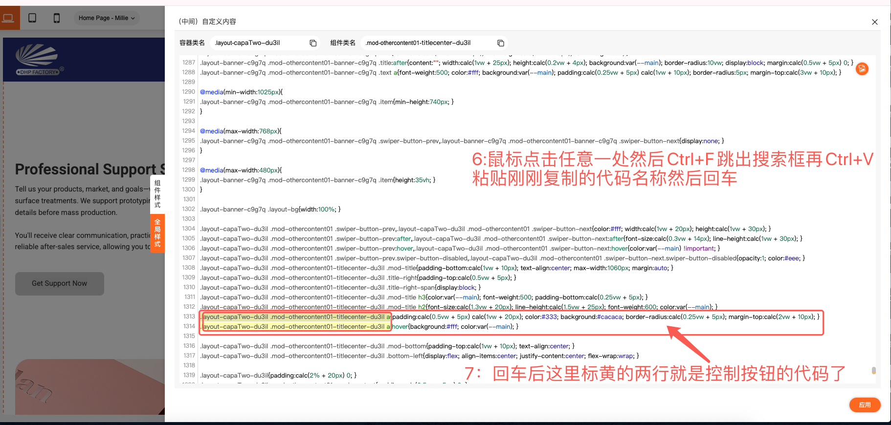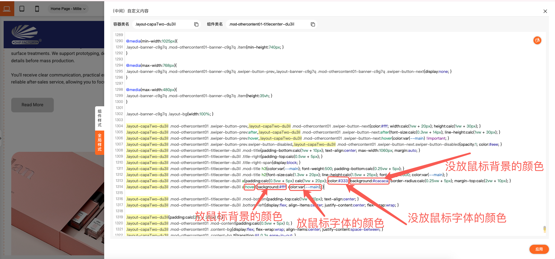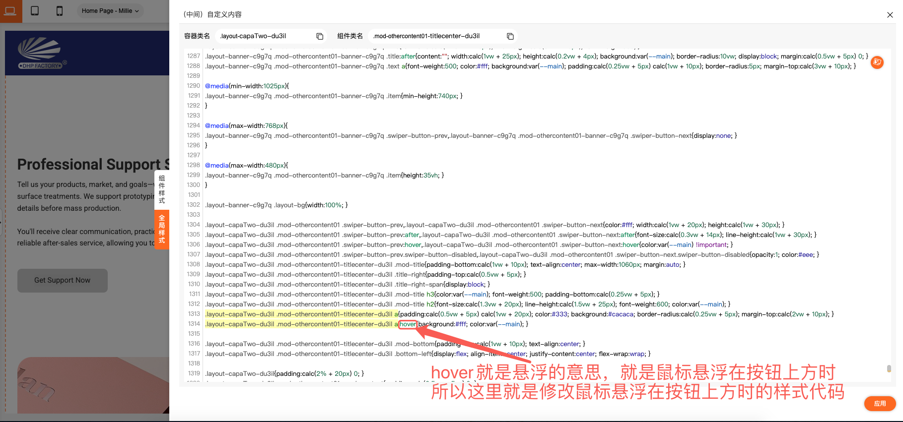 在这里我们就可以对鼠标悬浮在按钮上方时字体和背景的颜色进行修改,把第一步复制的颜色代码替换进去就可以了